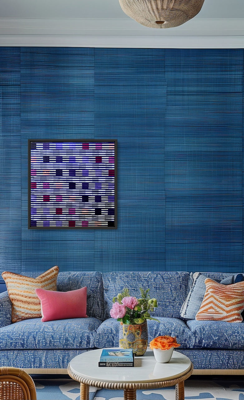 Bold geometric abstraction featuring layered stripes of blues and purples, creating depth, rhythm, and modern energy.