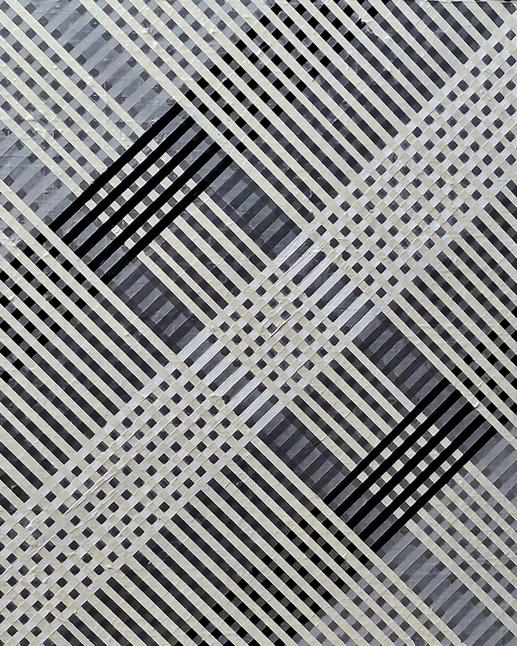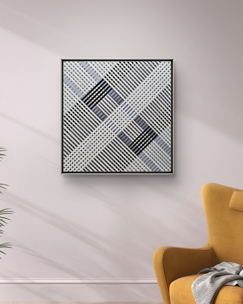 Original modern abstract geometric painting designed with hard-edge lines using black/white/grey color scheme to set this design apart. Professionally wrapped wood panel