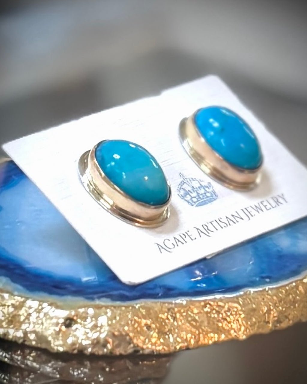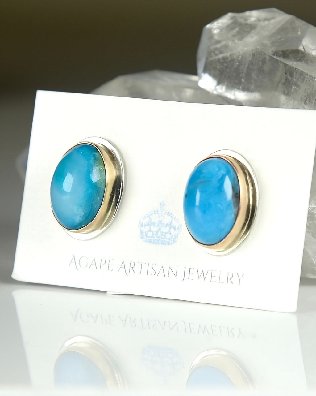 Stunning and rare, these gorgeous Peruvian Blue Opal studs are set in mixed 14k gold fill and sterling silver, measuring 16 x 12mm