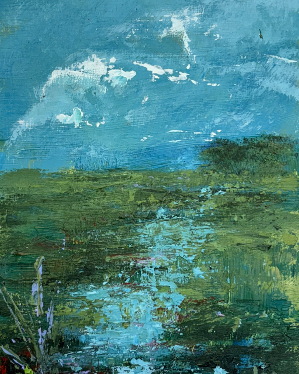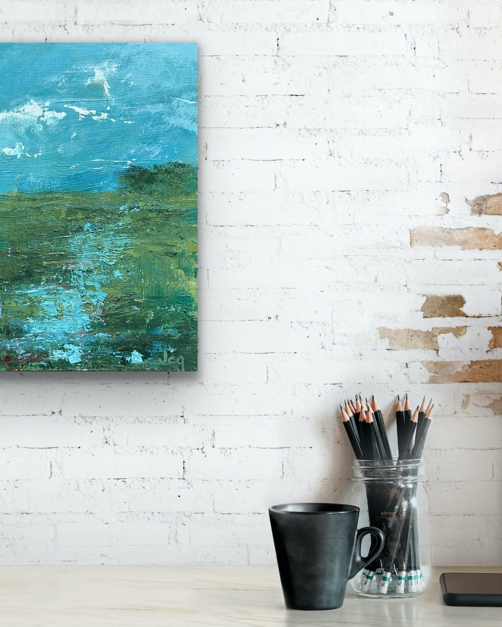 Impressionistic landscape, blues and greens. Paint applied on a 8x6 cradled board with palette knife creating interesting texture and interweave of color. A beautiful pop of color for a small spot!