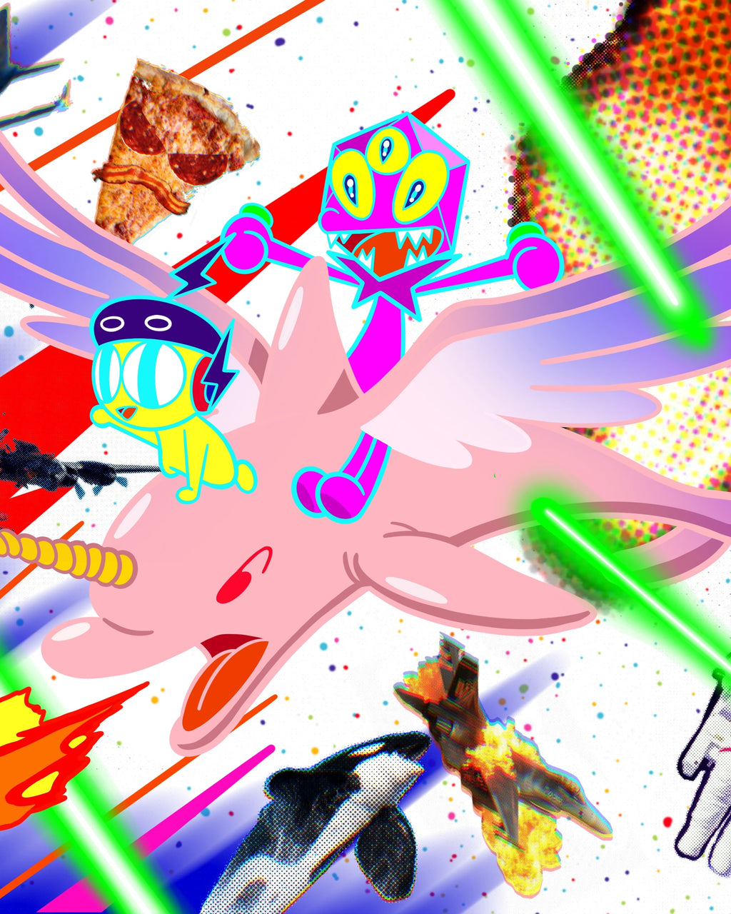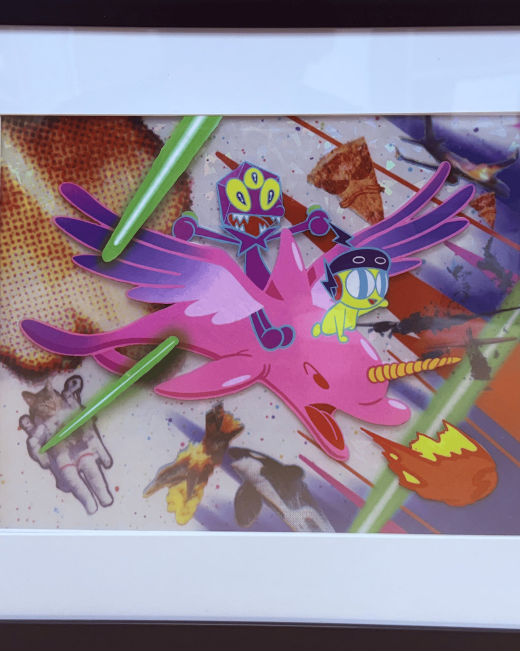 Satire of a generation that often responds to grave situations with flippant humor, emphasizing the disconnect between online culture and the gravity of reality. Pieces were created using animation cel and acrylic paint then layered to create a 3D look.