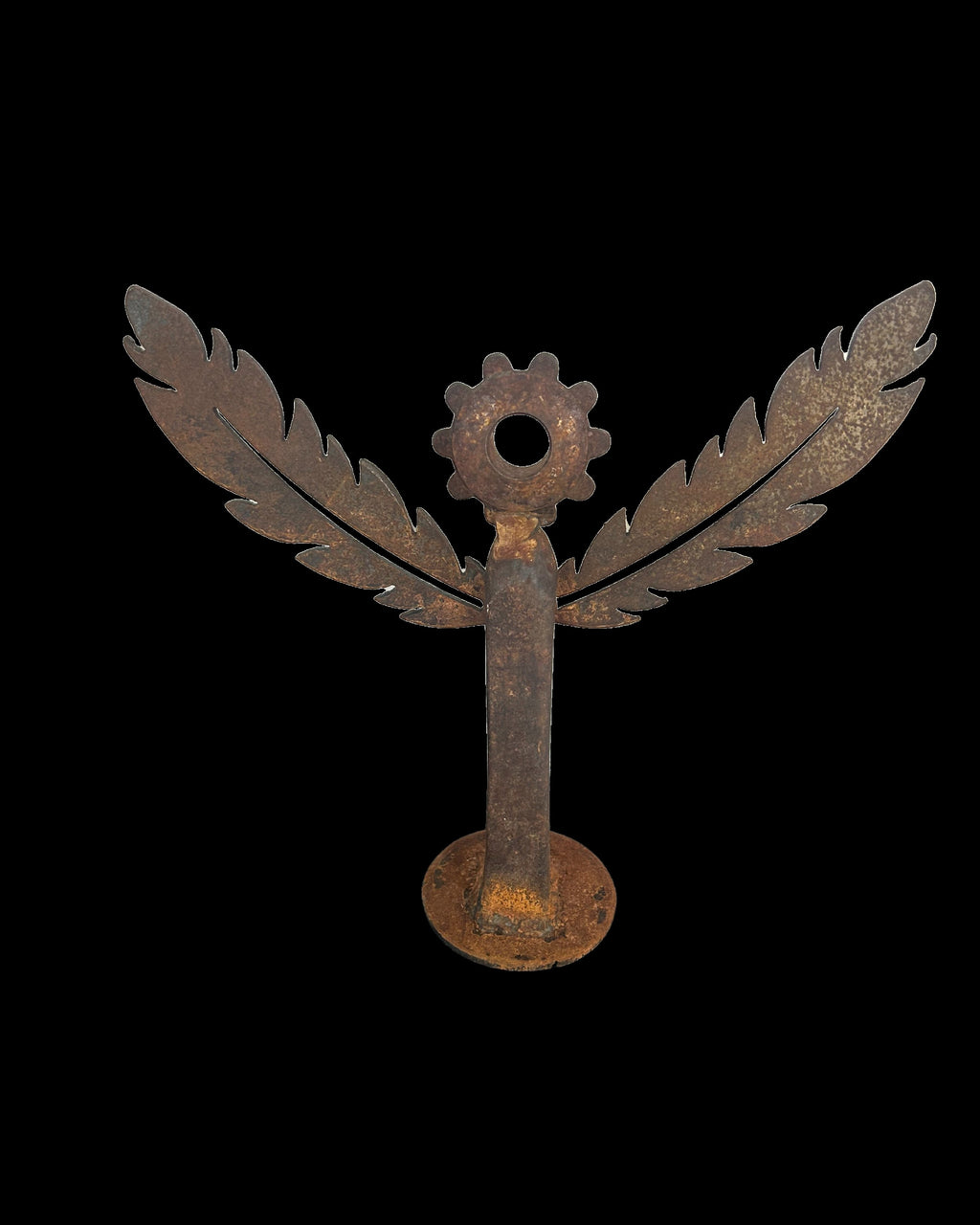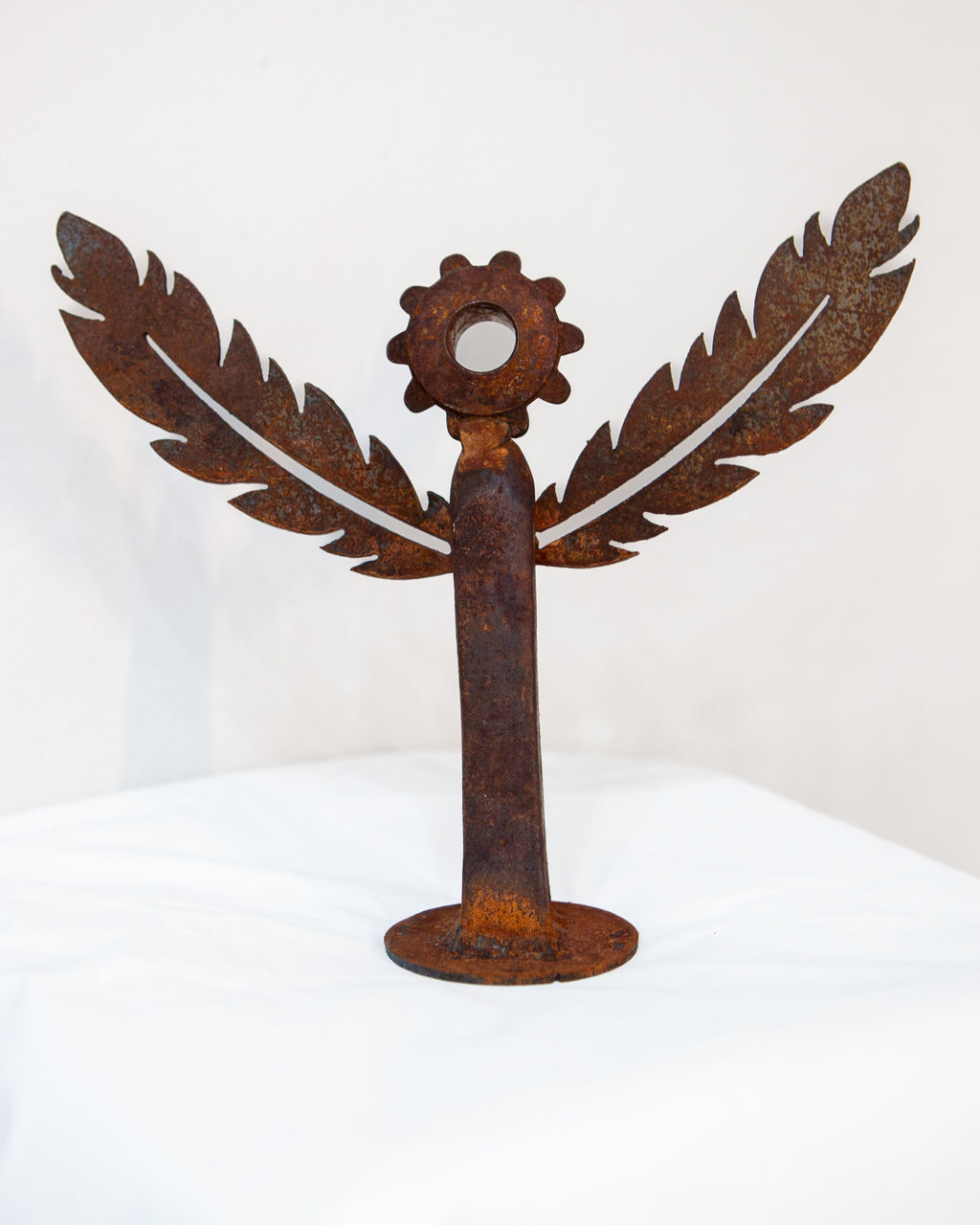 This angel is made from a pick-axe point and a gear and some machine-cut feathers.