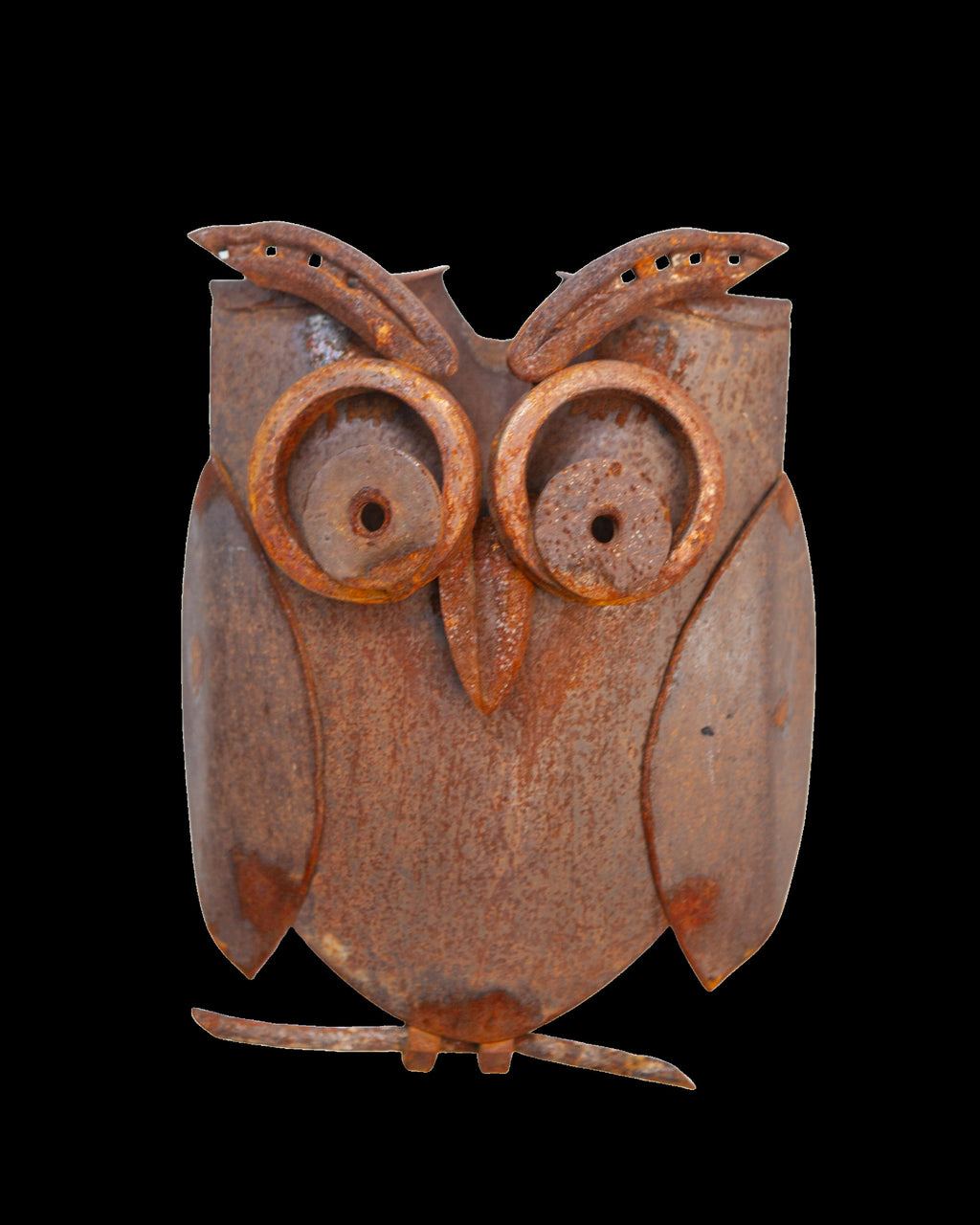 What's not to love? A wise owl, made from recycled metal. Two different shovels, tin snips, washers, rings, horseshoe, and nuts.