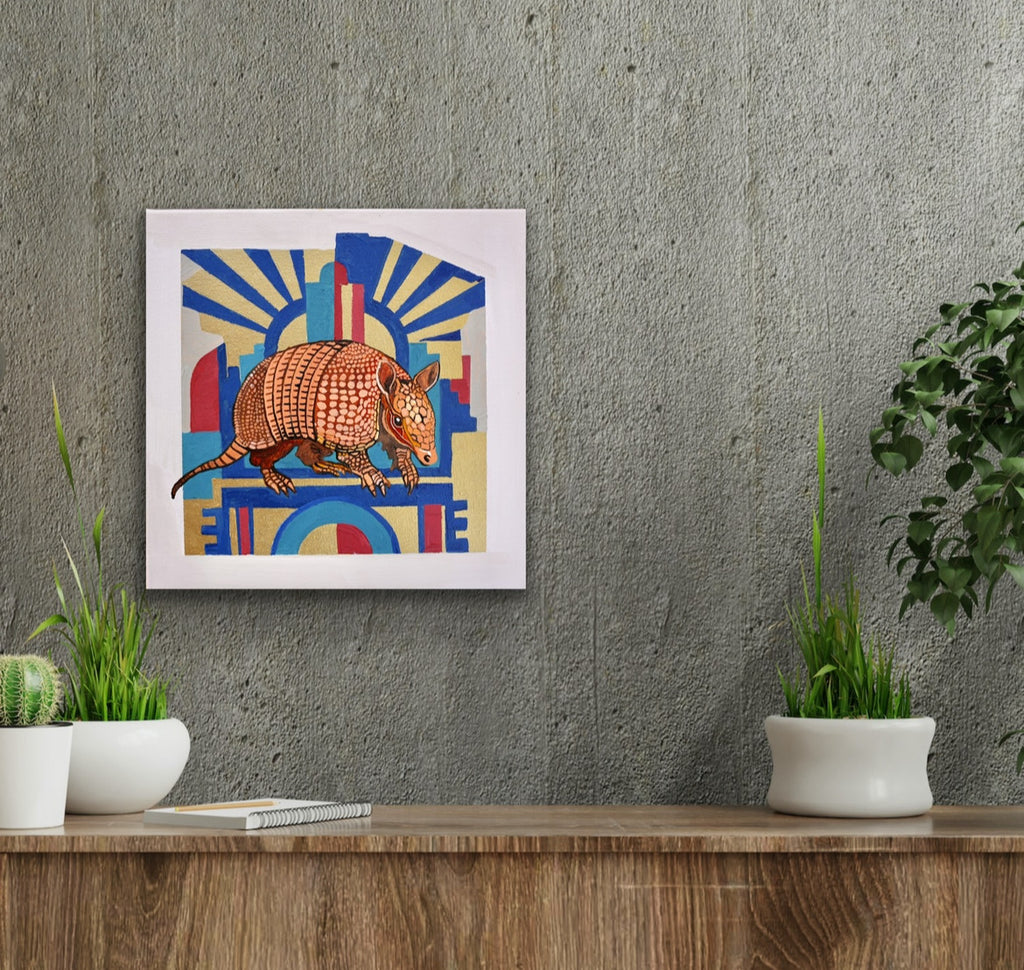 12x12 inch Acrylic on Gallery Wrapped Canvas depicts an cute armadillo wandering amongst southwest art deco vibes.