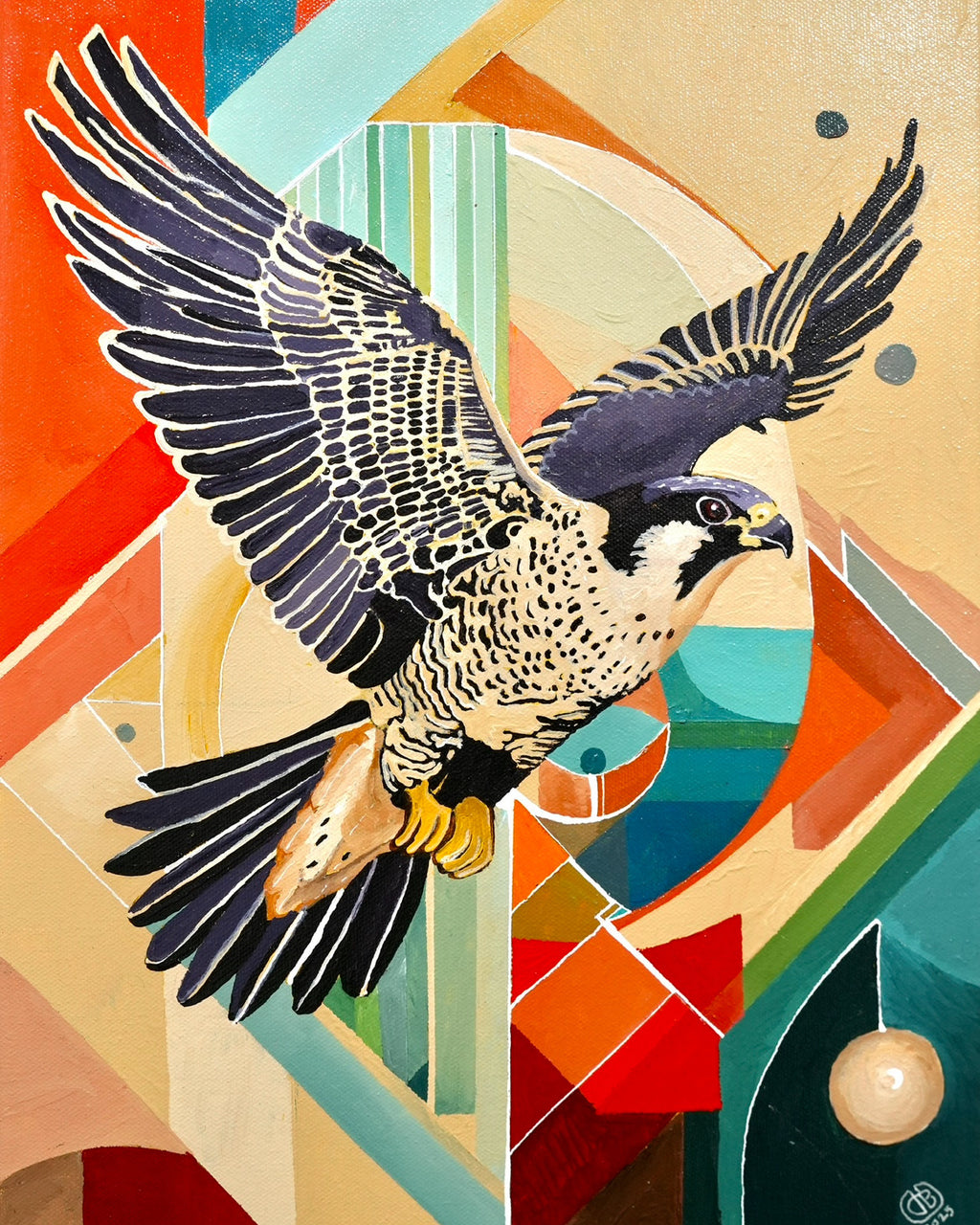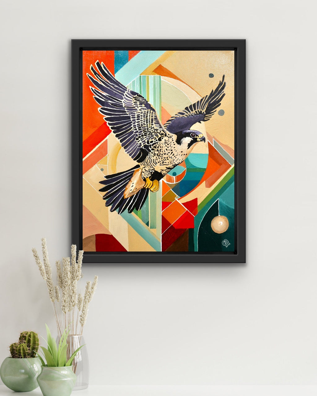 16x12inches framed original painting of a Peregrine Falcon soaring through a geometric space.