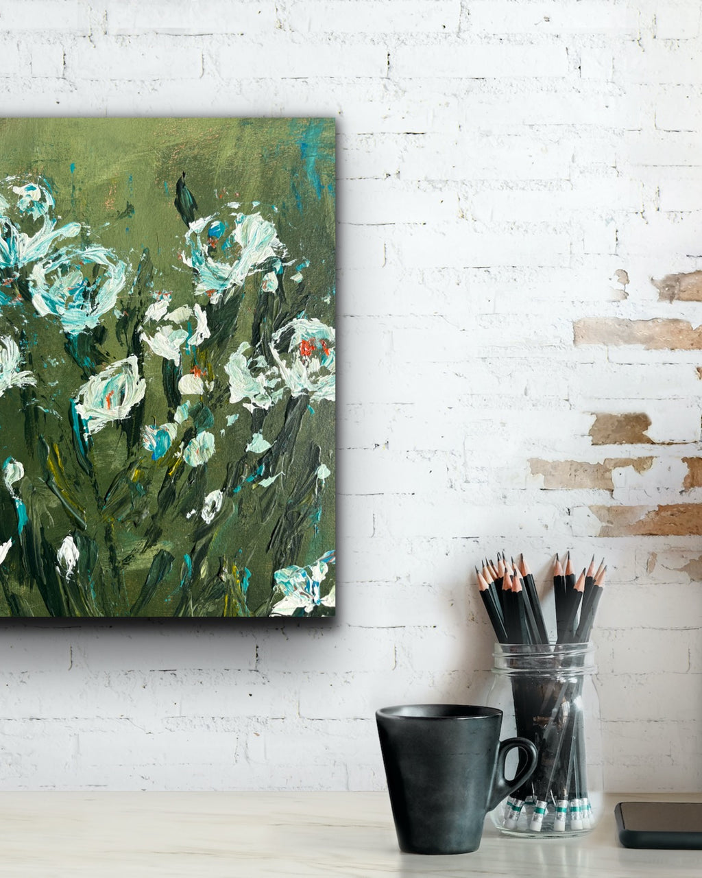 An impressionistic floral will bring a pop of color to just the right spot in your home. 12"x9" acrylic on archival artboard.