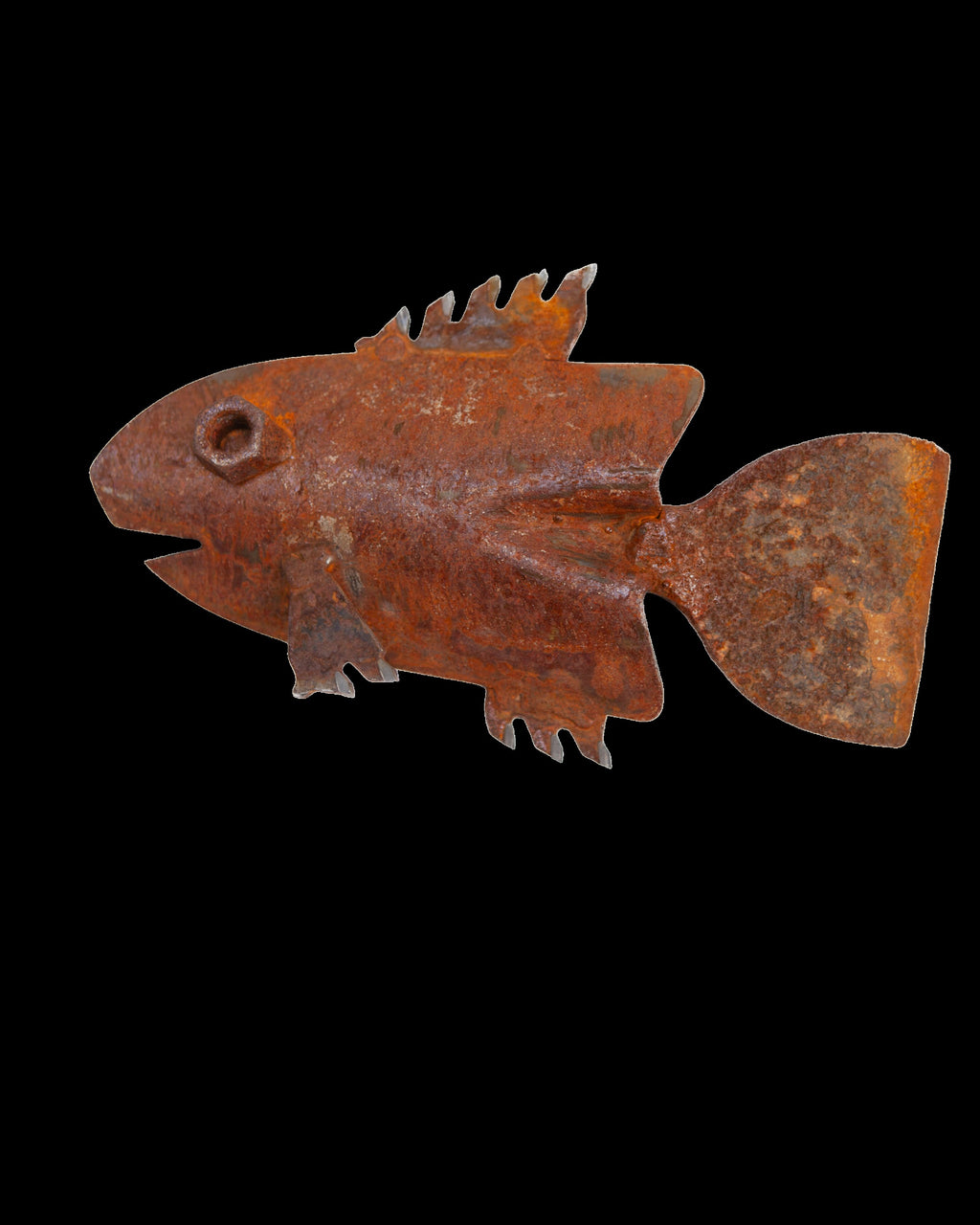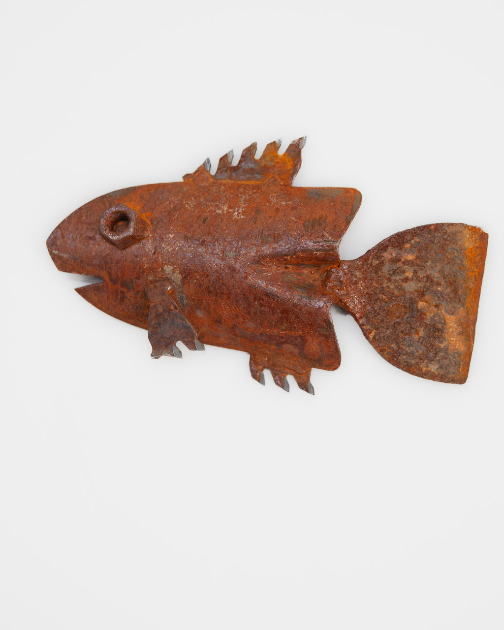 Cute little fish, the smallest one in the pond. Made from garden shovel, sawblades, concrete chisel, nut.