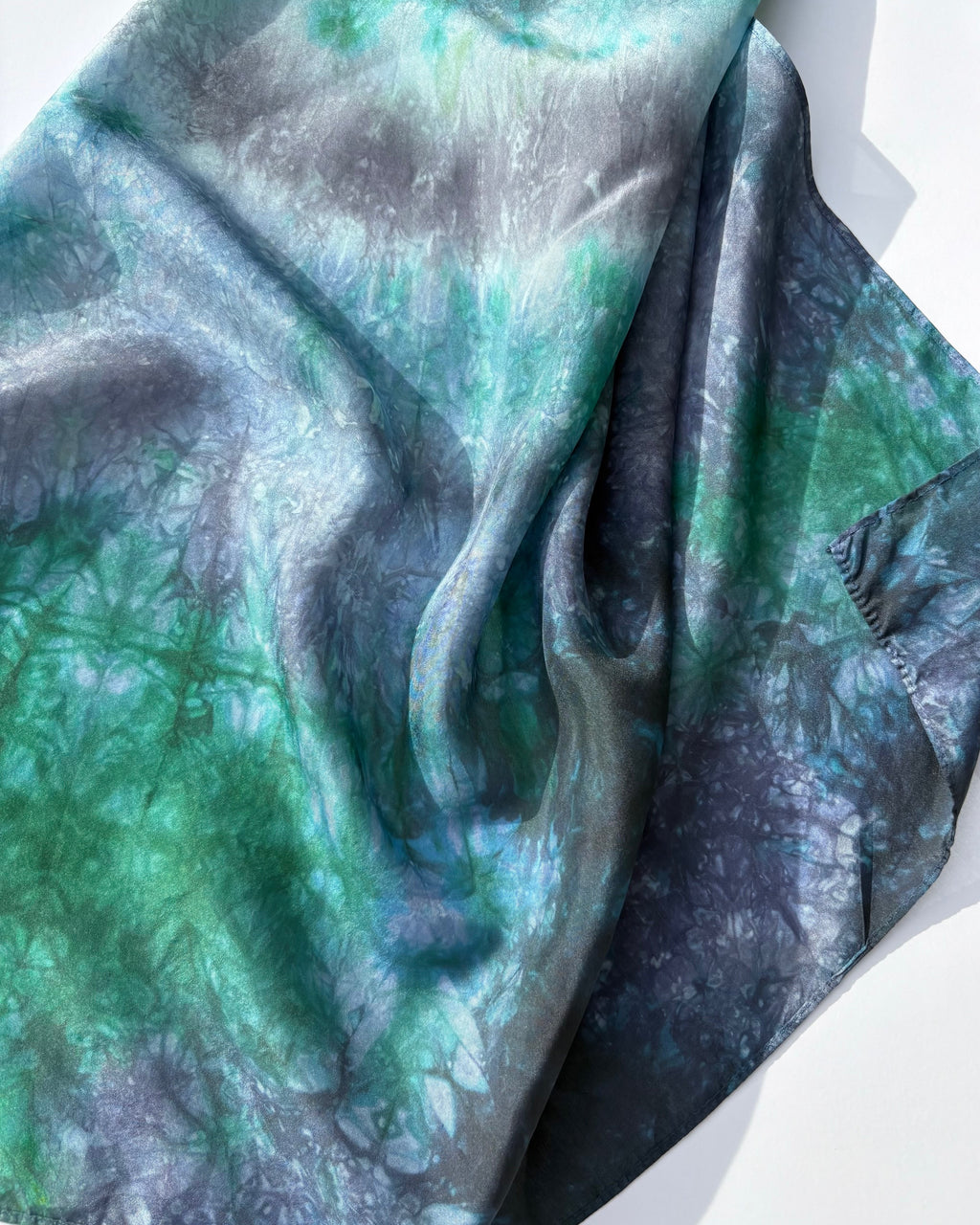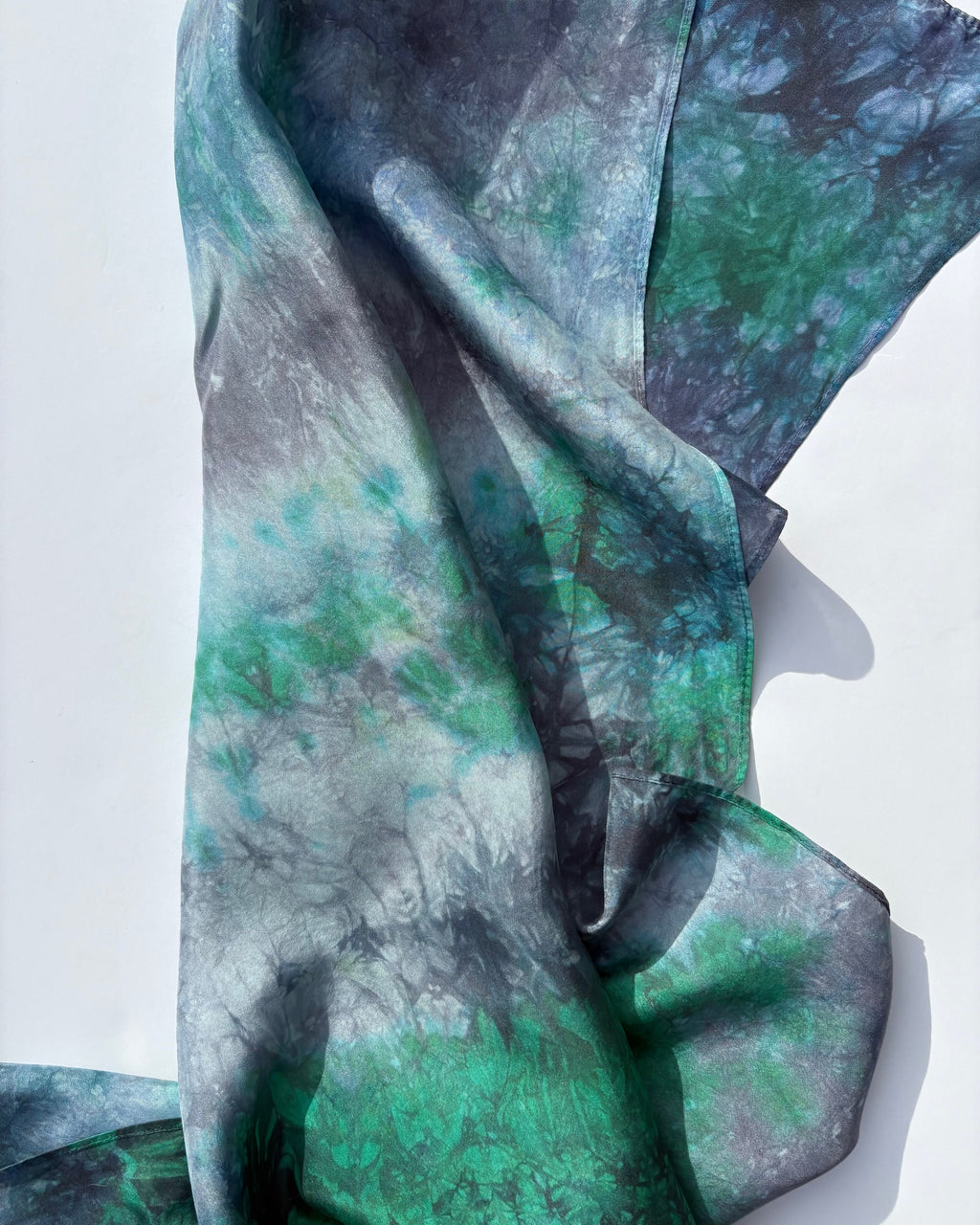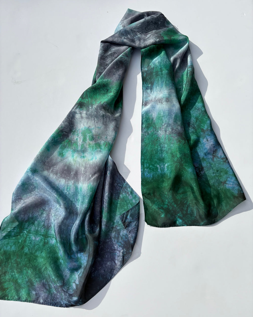 100% Silk Scarf 70" x 22" This scarf is incredibly lightweight, the perfect year-round accessory! • We go low and slow harnessing the power of the Arizona sun to heat and activate the dye bath. • Hand Wash separately • Art to wear, southwest style, tie
